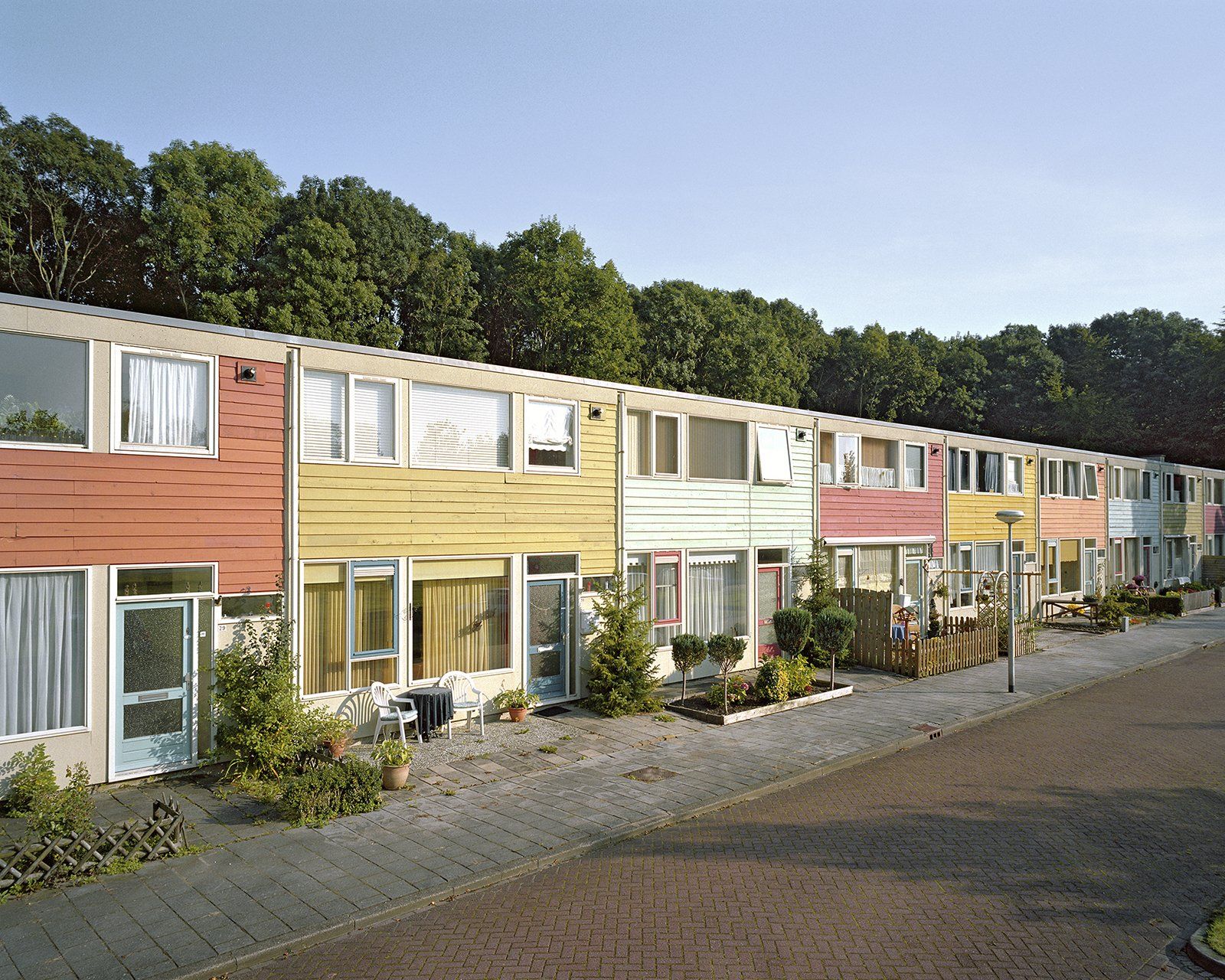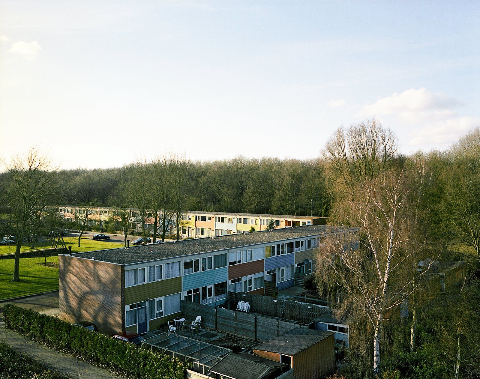 The village of Nagele in the Noordoostpolder (N.O.P.) is a striking example of postwar planning in the Netherlands: a brand new village on reclaimed land. It was one of 10 newly build villages but the only one designed by young modernistic architects like Aldo van Eyck, Gerrit Rietveld and the landscape architect Mien Ruys. One of its distinguished features was that all houses had flat roofs. All villages were intended for a largely agricultural population and the land was divided into identical plots situated along the straight lines the new roads cut through the landscape. The first inhabitants of Nagele were meticulously selected by inspectors which would travel all provinces of the Netherlands on motorbike checking if the applicants were hardworking, decent and strong, trying to compose a population which would be representative of the inhabitants of the Netherlands as a whole.